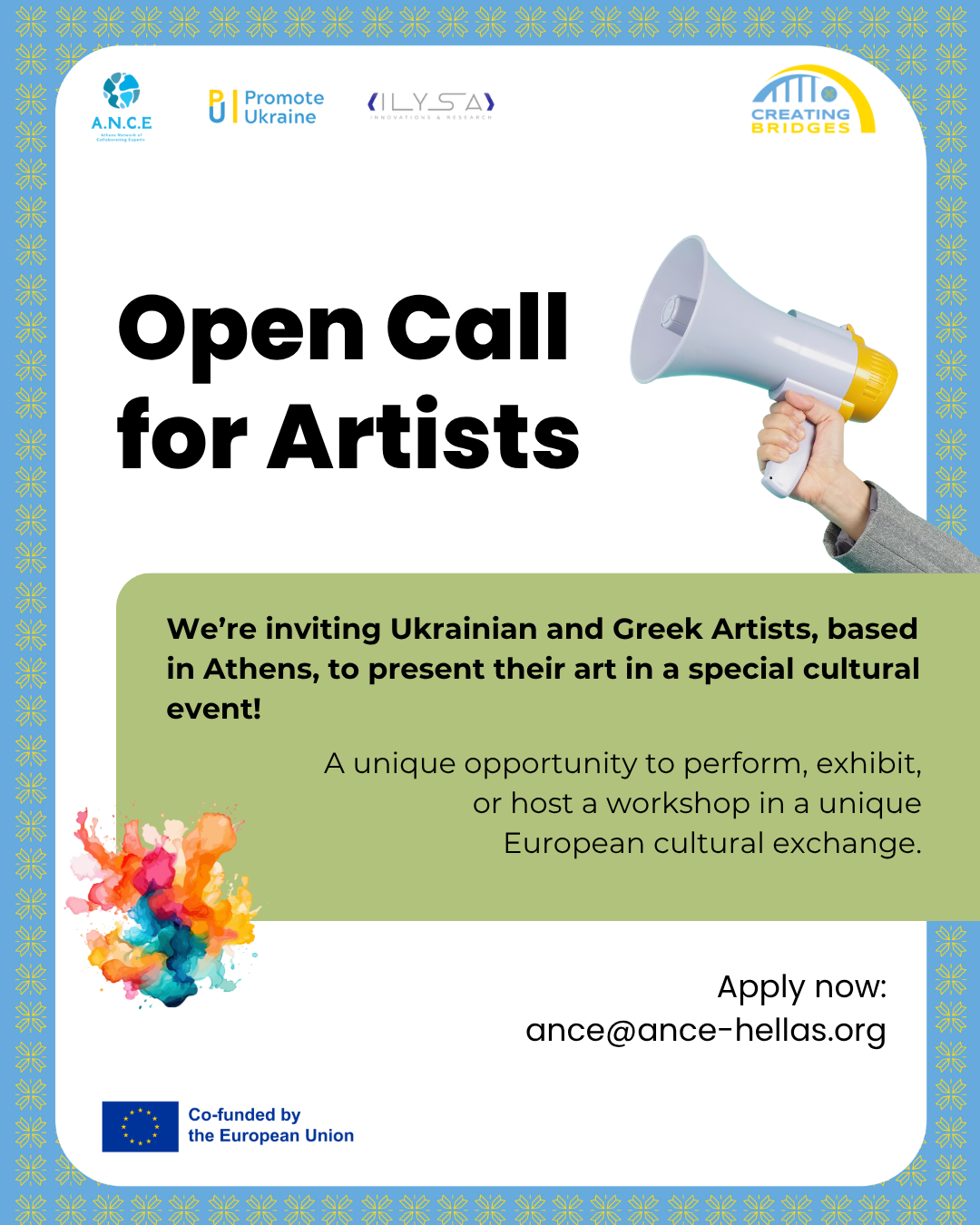 Προσκαλούμε, καλλιτέχνες από την Ουκρανία και την Ελλάδα που έχουν βάση την Αθήνα, να συμμετάσχουν σε μια ξεχωριστή πολιτιστική εκδήλωση τον Ιανουάριο του 2026, γιορτάζοντας τη λήξη του έργου «Creating Bridges: Enhancing Cultural Exchange between the EU and Ukraine».